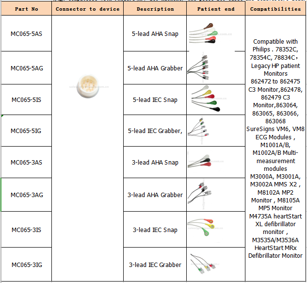 "Združljivo s Philips. 78352C, 78354C, 78834C ga Legacy HP monitorji za paciente 862472 do 862475 C3 Monitor, 862478, 862479 C3 Monitor, 863064, 863065, 863066, 863068 SureSigns VM6, VM8 ECG moduli, M1001A / B, M1002A merilni moduli M3000A, M3001A, M3002A MMS X2, M8102A MP2 Monitor, M8105A MP5 Monitor M4735A heartStart XL monitor defibrilatorja, M3535A / M3536A HeartStart MRx Defibrilator Monitor "